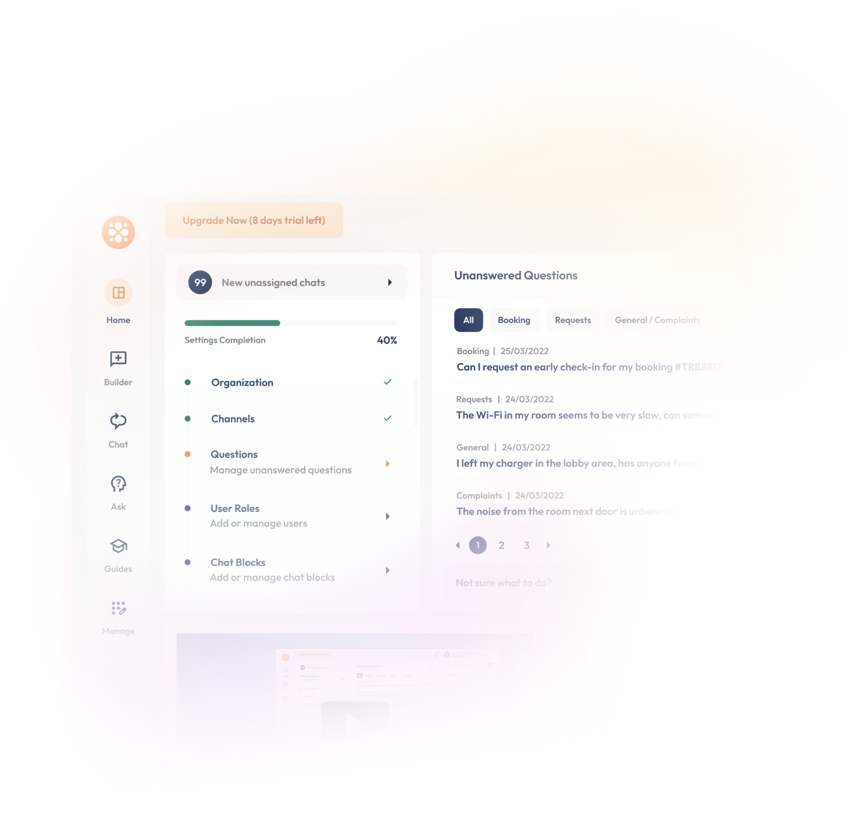 An all-in-one SaaS portal for the travel and hospitality industry, empowering businesses to manage bookings, guest chats, and a self-service knowledge hub with a built-in chat builder.