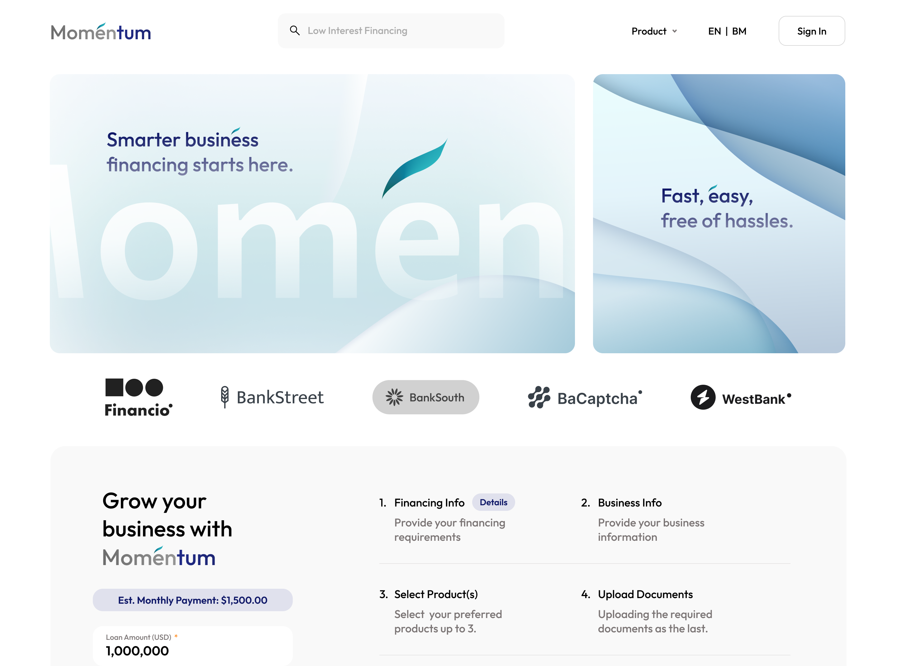 While the shipped product (imSME) successfully served 225k+ visitors under strict GLC guidelines, Momentum represents the "Ideal State"—an evolution of the design system that retains the core business logic but applies international fintech standards to maximize user trust and efficiency.