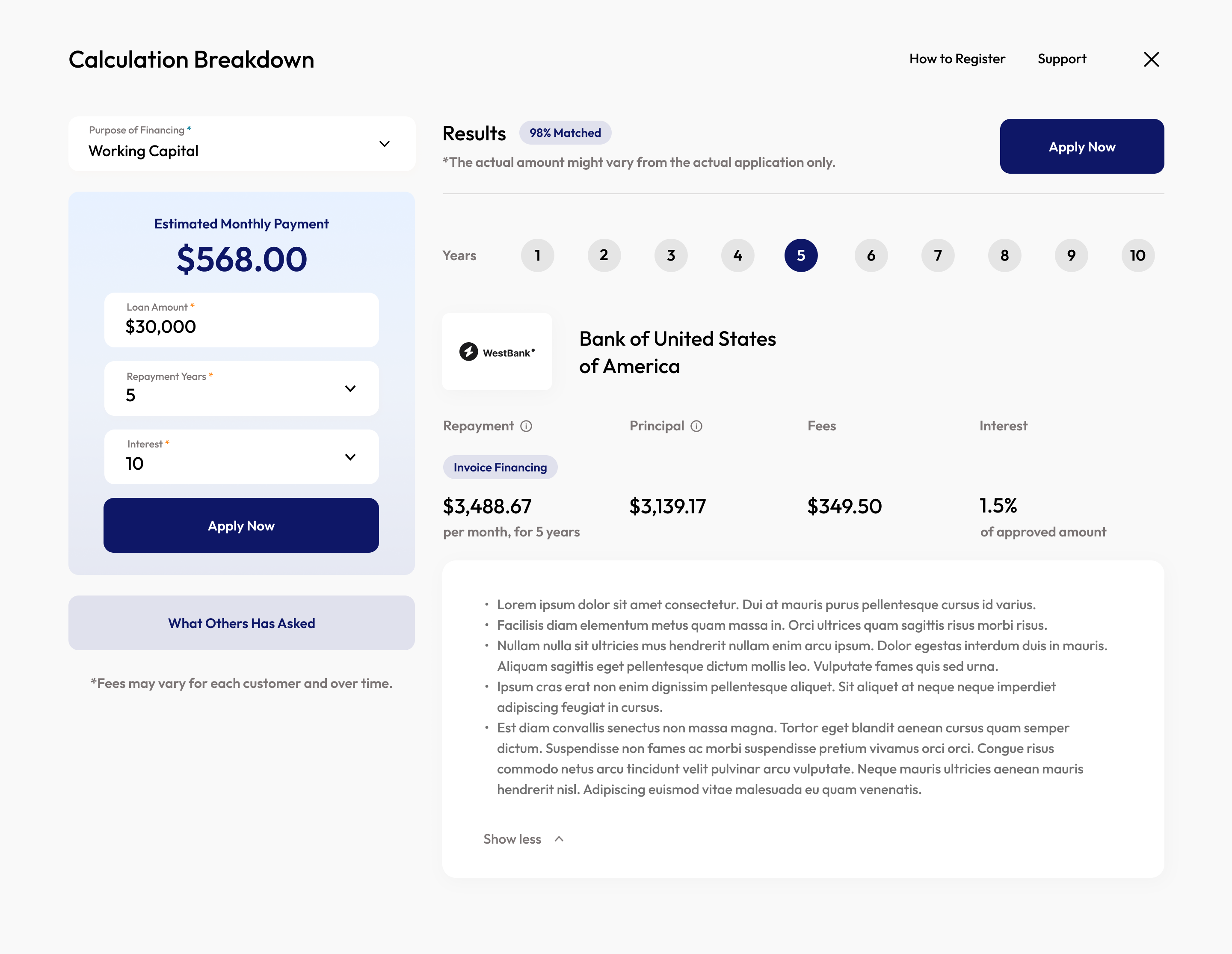 I designed Momentum, a guided and transparent pathway to business financing. The platform prioritizes clarity and education, featuring an instant eligibility calculator, a jargon-free annotated application form, and a visual dashboard that tracks every step. It’s designed to feel less like a bank and more like a helpful partner.